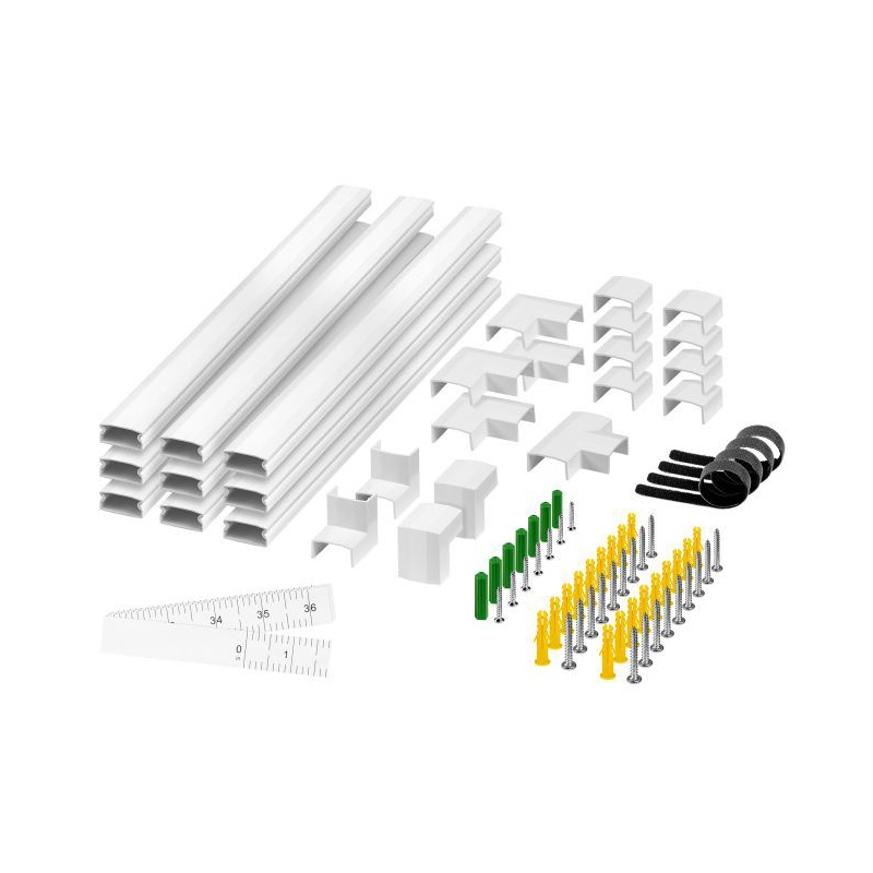 Sada obsahuje celkovo 67 komponentov, čo vám umožňuje vytvoriť káblovú trasu prispôsobenú rozmiestneniu zariadení vo vašej domácnosti. Na presné nastavenie rozstupov medzi koľajnicami použite krajčírsky meter, ktorý je súčasťou sady.
