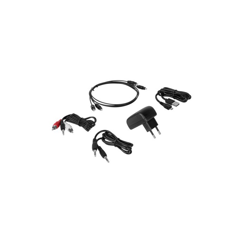 Obsah balenia: Napájací adaptér, kábel USB<->micro USB, kábel jack<->jack, kábel jack<->2x RCA, 2x optický kábel