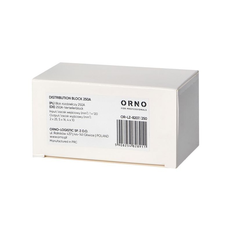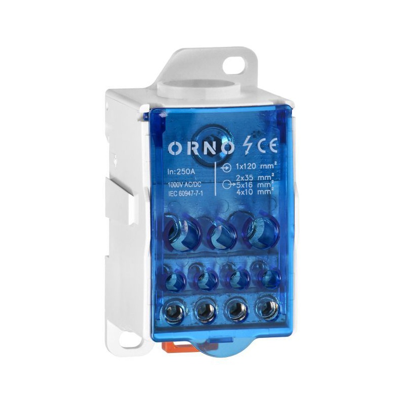 Rozvodný blok 250A je vybavený vstupnou svorkou 1x120 mm2 a výstupnými svorkami 4x10, 5x16 a 2x35 [mm2]. Rozmery zariadenia 96 x 49 x 50 mm. Rozvodné bloky ORNO sú navrhnuté tak, aby umožňovali rozšírenie s možnosťou vytvorenia zložitejších elektrických pripojení a distribúcií. Svorkový rozvodný blok má stupeň ochrany IP 20 a je dodávaný v modrej farbe.